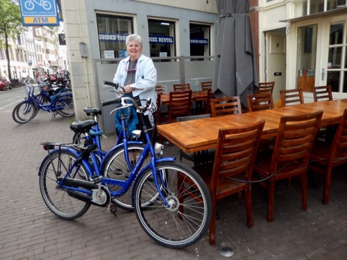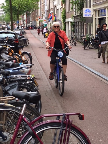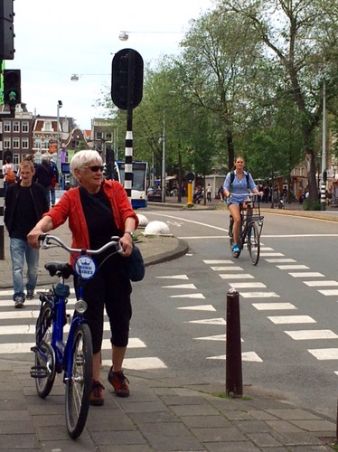 Susan had to coerce me into biking in the city! As much as I bike, I seldom bike in a city — much more a country girl than a city girl. ;’-) There are wonderful lanes and paths for biking all through Amsterdam, and at any very busy intersection with trams, buses, walkers, cyclists it all works fine. That of course is because everyone knows what to do and when to do it. Everyone but me! So I did some walking along this bike ride in the city.