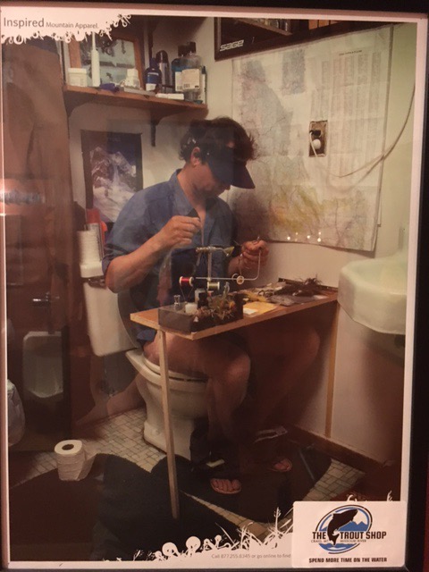 We had a full day of de-camping in Lincoln, driving to Great Falls, looking for a place to camp, finding a place that I balked at and setting up camp there. Along the way we stopped at the fishing town of Craig which is made up of five different fly fishing shops. Five shops in one country block makes for a lot of fly fishing gear for Susan to gawk at, and find the one thing she may not already own. In the restroom of the largest shop/lodge was a photo hanging above the toilet. I can only hope that it has not given Susan any decorating ideas.