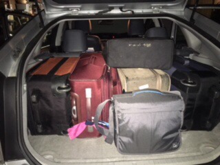 At our pre-trip meeting we even practiced putting in our four suitcases and saw we had PLENTY of room for helmets and the extras we would need that did not fit into our suitcase. Well, empty suitcases take up a lot less room than (over)filled ones. Fortunately Linda had uncovered a secret compartment under the suitcase platform where we could fit in that extra stuff. And good thing that Brenda’s husband Bill was there to help us figure out the puzzle and jam those suitcases into their spot! Now we were ready to get on the road.
