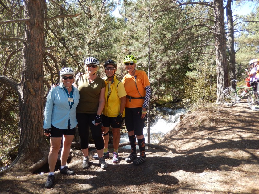 The tumble was not one of the four Badlands Babes, and fortunately was not too serious. Sue bumped into her husband, tangled their wheels and she went down. Some scrapes and gashes, but all in all not too bad. We were near our rest stop at the time, and after good attention by several people, she was cleaned up and bandaided. Sue elected to skip the climbing part (good excuse Sue!) and join us on the more downhill grade to Hill City. She’s a tough gal.