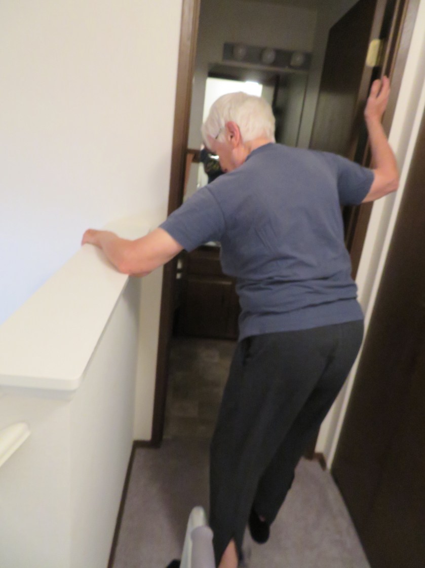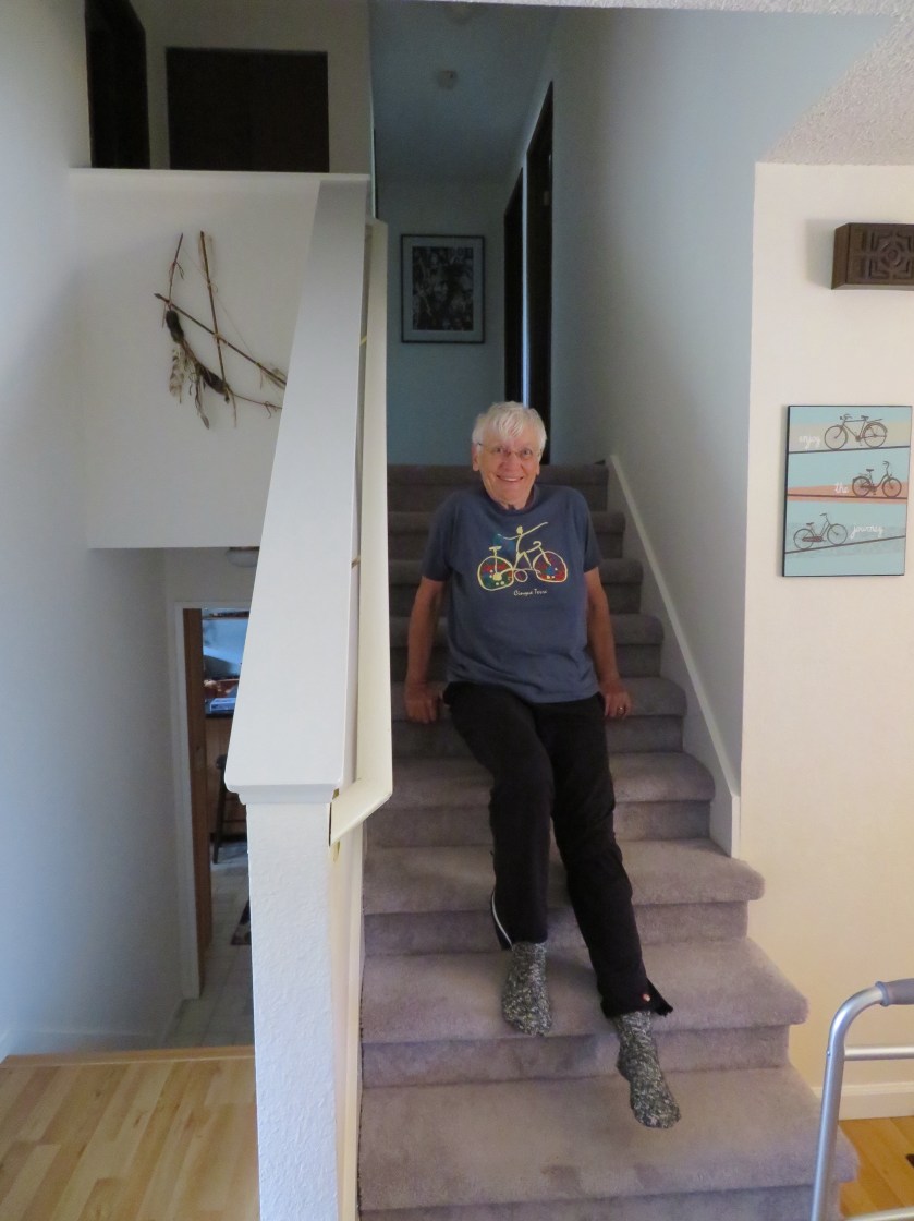 I am more able to do things that I could not do just a few days ago (in addition to the butt scoot): make my bed; heat & pour my tea; empty the dishwasher; fix my breakfast. At least I feel I have relieved Susan of a few of the chores she has been saddled with, though she still has to carry things for me.