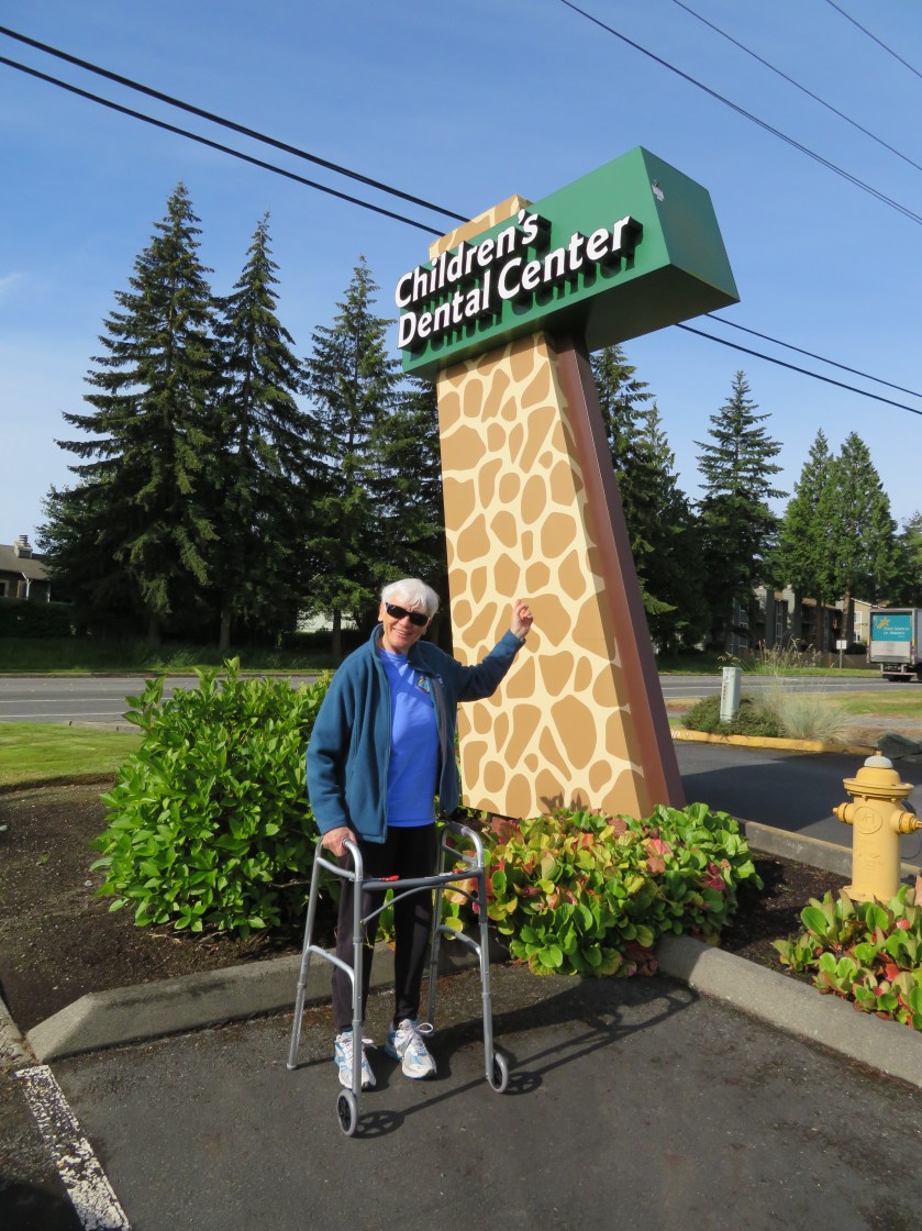 We did not get a a very good photo of the Grands, but it was grand to see them ;’-)… Even if Jaydon insisted on wearing the fake teeth, Kaitlyn was crouched down to the floor, and Lucy had her back to the camera. But look at me — down on one knee and not holding onto the walker ;’-)