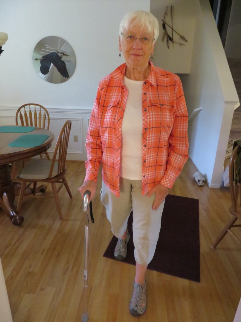 Walking by cane to and from the bathroom, I find that I am apparently not quite ready for full time use. There remains a bit too much pain on a lot of weight bearing, so I will continue with the walker and use the cane periodically in the house.