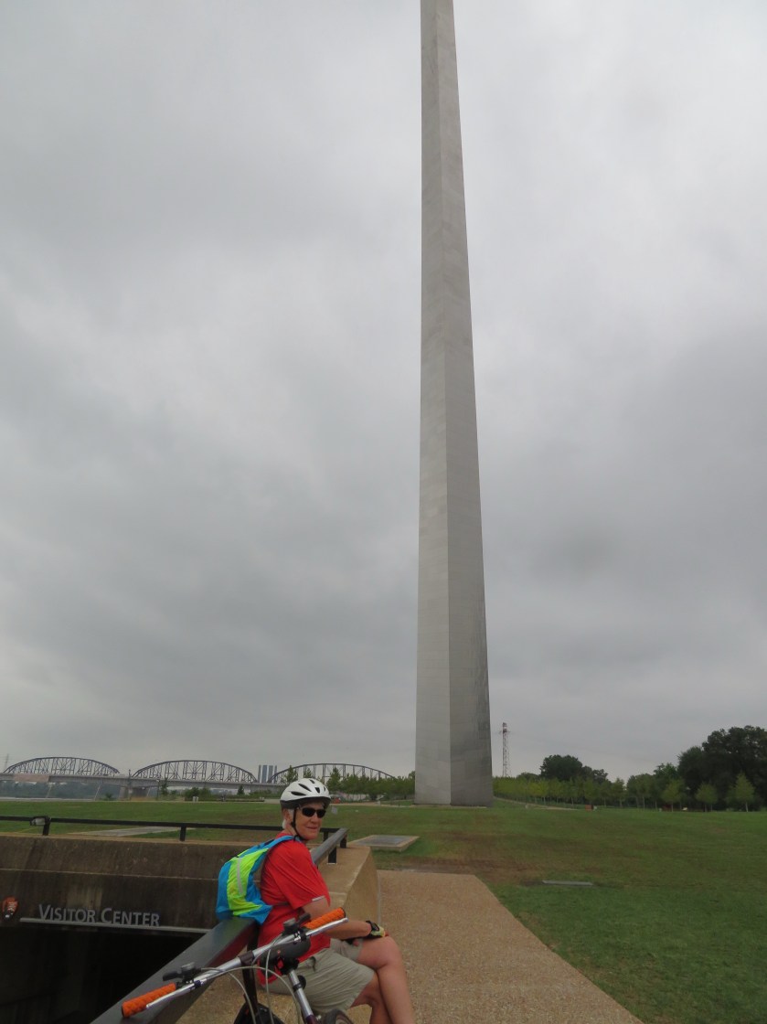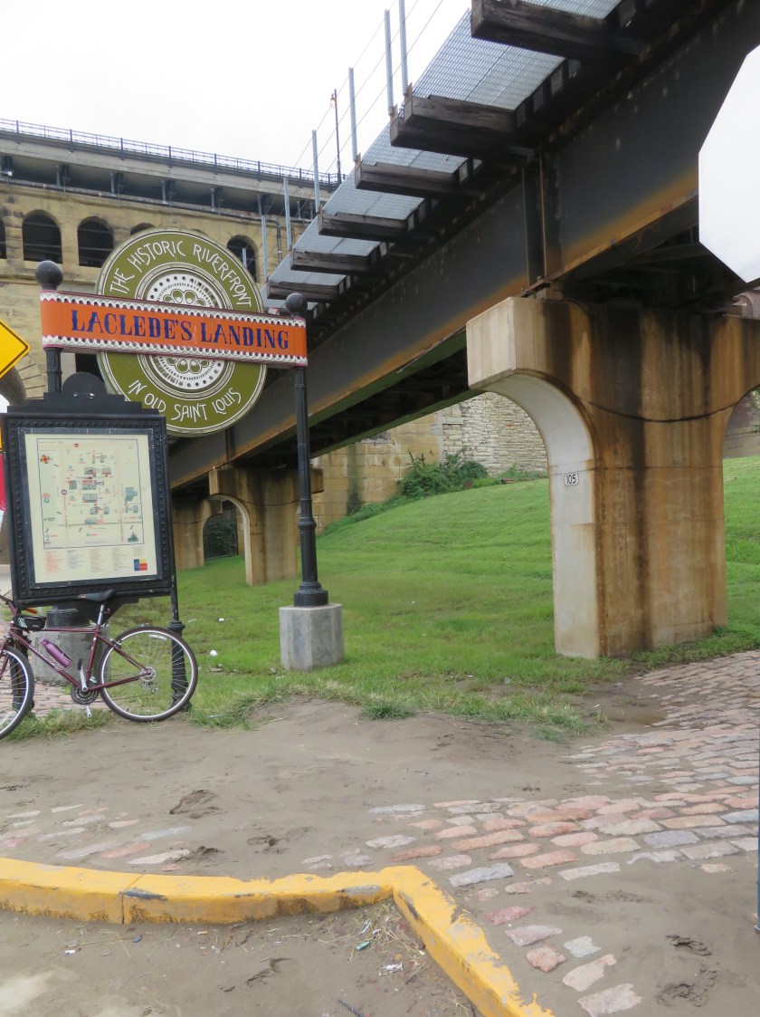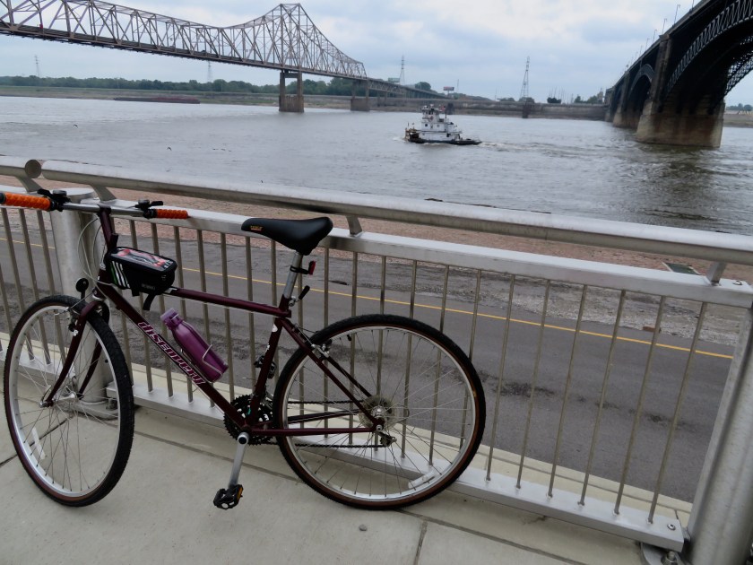 We had a slight intention to drive across the river to Illinois for me to bag my 31st state bike ride. But the time was inching into mid-afternoon and the sky was rather dark and rain was threatening, so we opted for the Riverfront Trail in St. Louis.