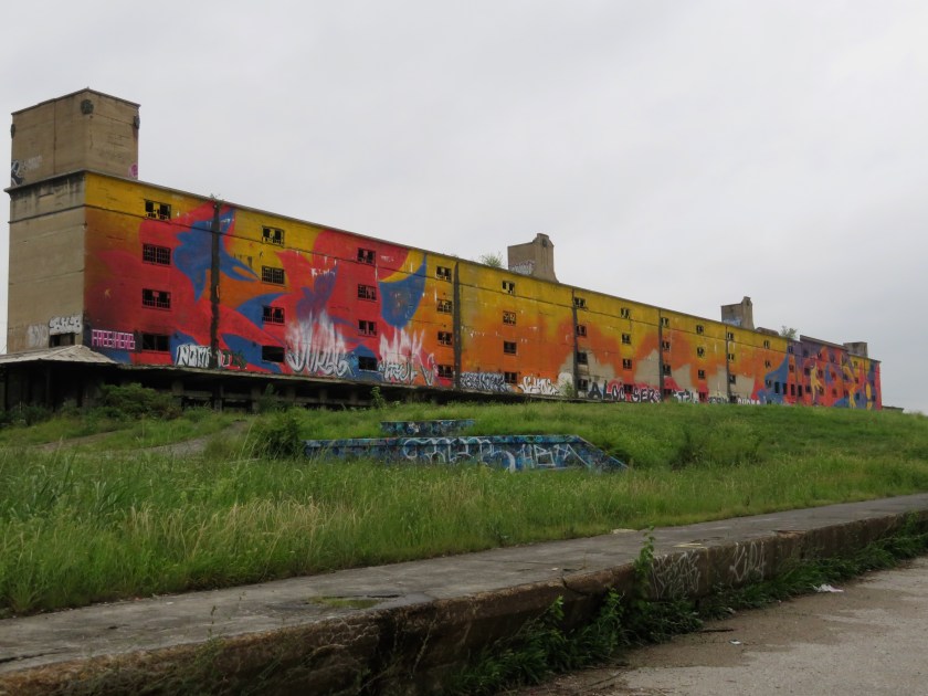 The other end of the trail had different interesting, and a bit sad, things to see. This was what seemed to be an abandoned industrial area of some sort, although there was a small door or two open at one corner with what appeared to be workmen doing something.