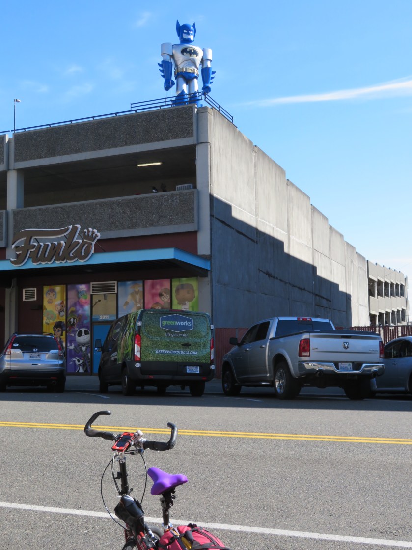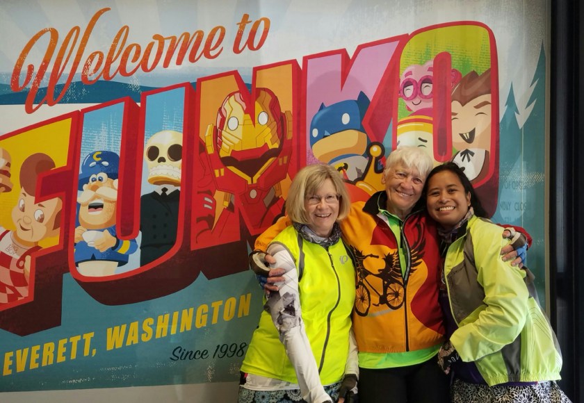 Raquel, Cindy and I rode into Everett on the hunt for a Superhero. A photo of a superhero with my bike would complete my Bicycle Ride and Seek challenge for the month. We found him at FUNKO.