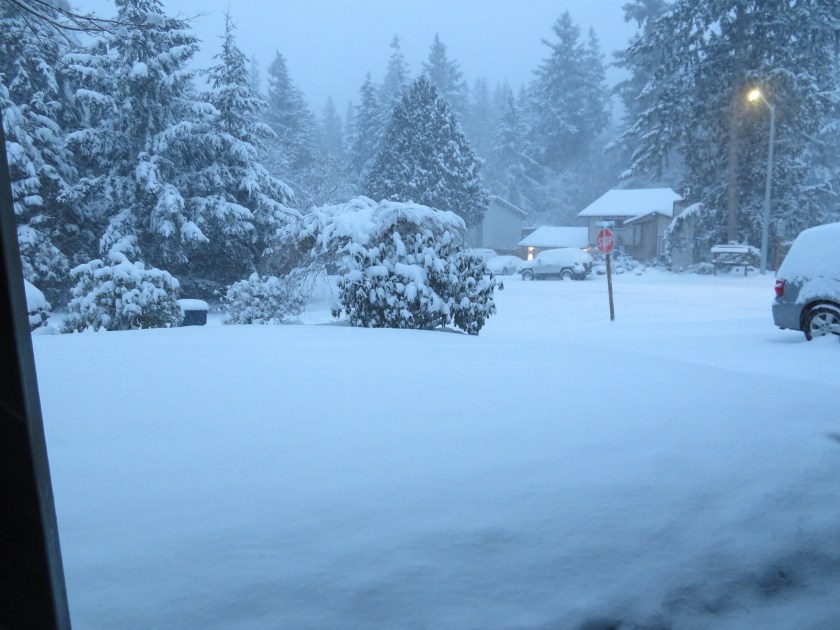 It is still snowing this morning with expected 5-6 inches by the end, and SeaTac Airport has canceled flights!! This is our first snow of the season and it is a good one.