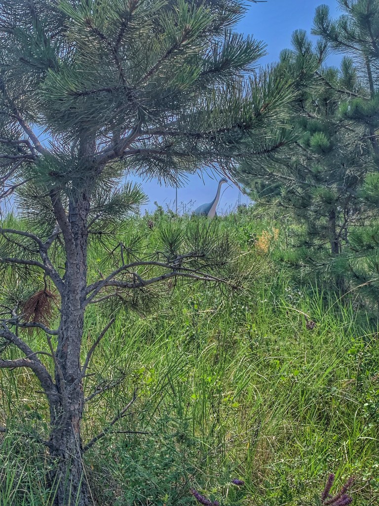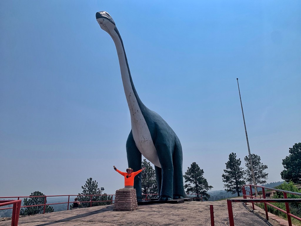 Leaving Spearfish we headed further east and made a stop at the Dinosaur Park thinking we would send photos to the Grandboys, E&A, as they are very into dinosaurs. So into them that they were not impressed by our stop or this park or the photos because these were not real dinosaurs. I donβt know where they think we will find real dinosaurs, but Susan and I know that this is a stop we would not have done except for photos for the boys. Susan at least did find a tee shirt for each of them, but I imagine they may not be impressed by those either since the T-Rex on the shirts is not real~