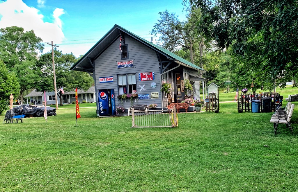 I kept looking for a trailhead sign that said Root River Trail, but never did see one. Starting from our campsite we rode bikes to the ‘smallest town on the trail’ of Whalan and this is the best I could do for a sign — at top middle.