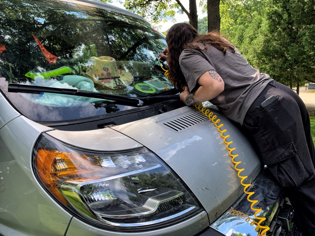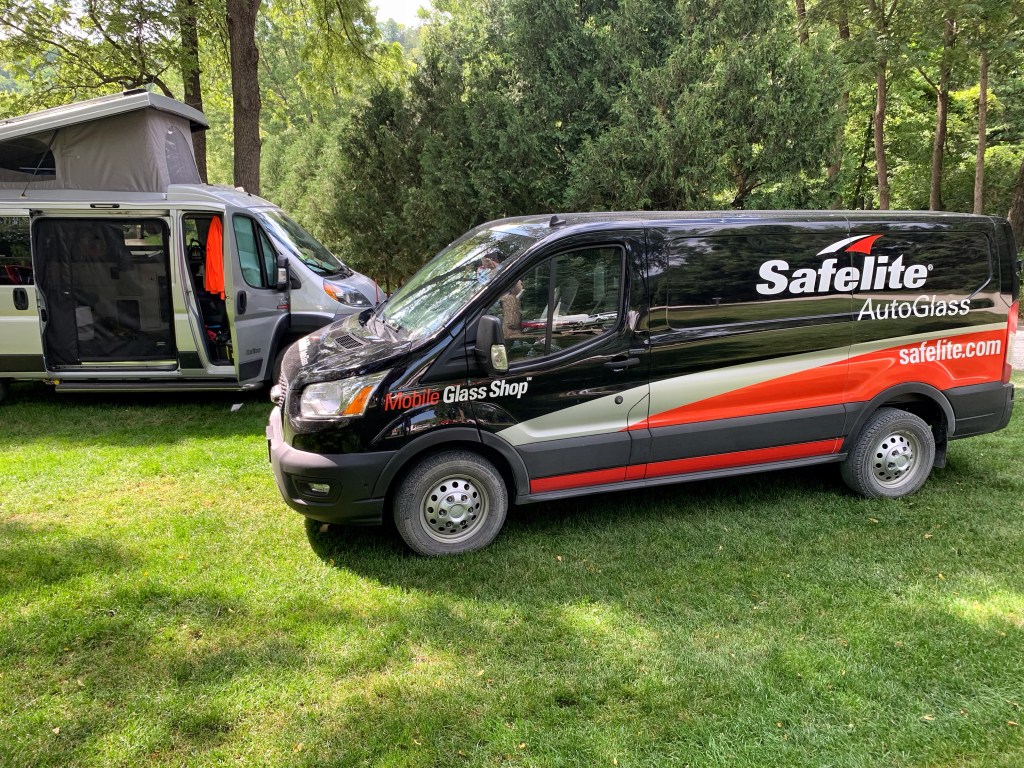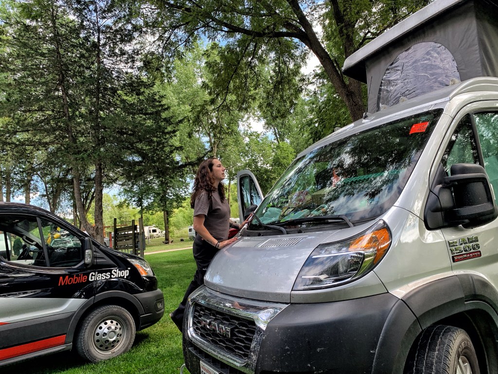 After all of Susan’s anxiety to be back to camp by noon (we got back at 11:30) so to not miss anything involving the glass repair scheduled between 12:00-5:00, the repairer got there at about 3:45. Did a fantastic job and told us each step of the way what she was doing. Very intricate.