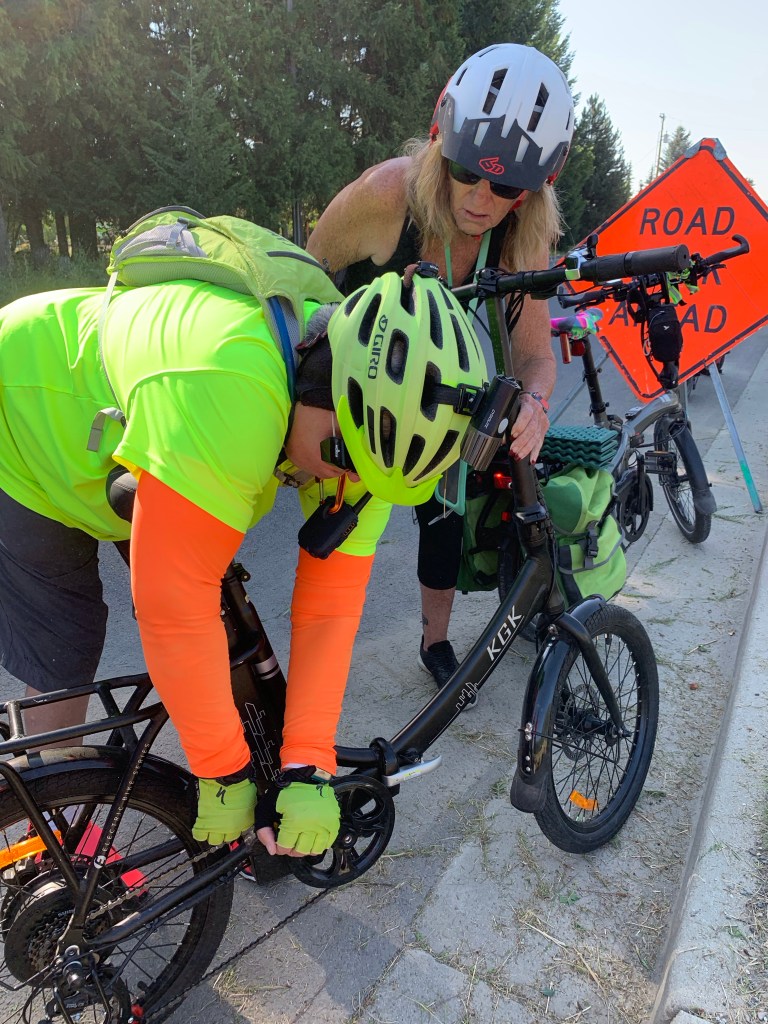 And whadda ya know, Susan to the rescue again for Karen to adjust her wayward saddle. Susan was the only one of us all who had tools to fix what needed fixing. And now others know the benefit of Susan carrying all that gear!!!