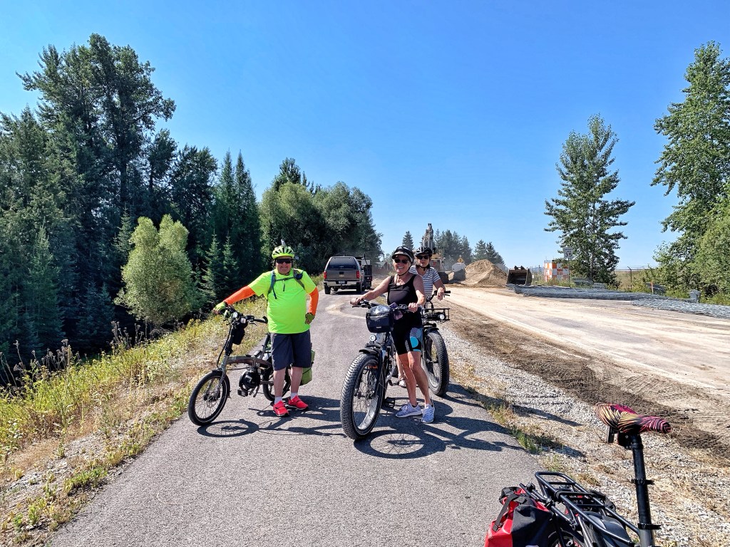 End of the group riding together as we came to the impassible road construction. Mimi walked over to the workmen to plead our case of needing to get to the trail, but no dice. We had to turn around.