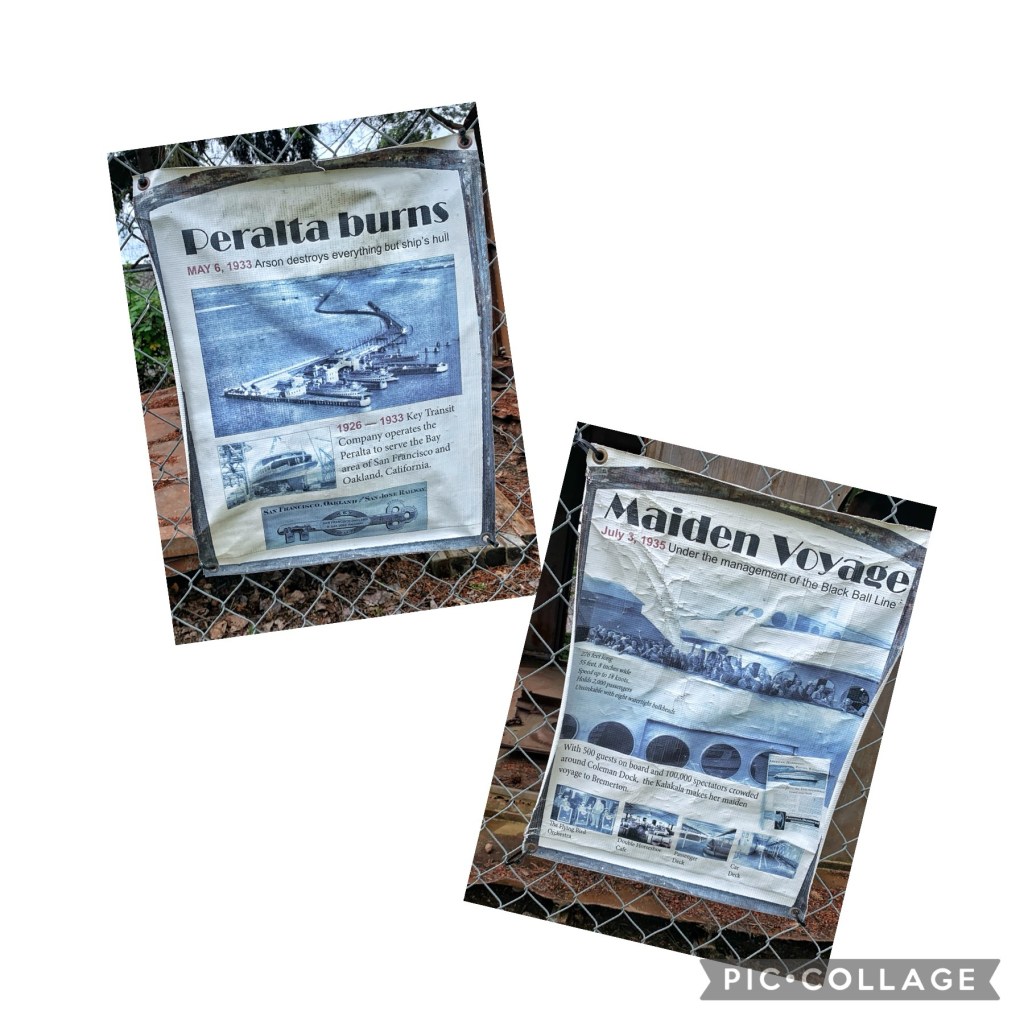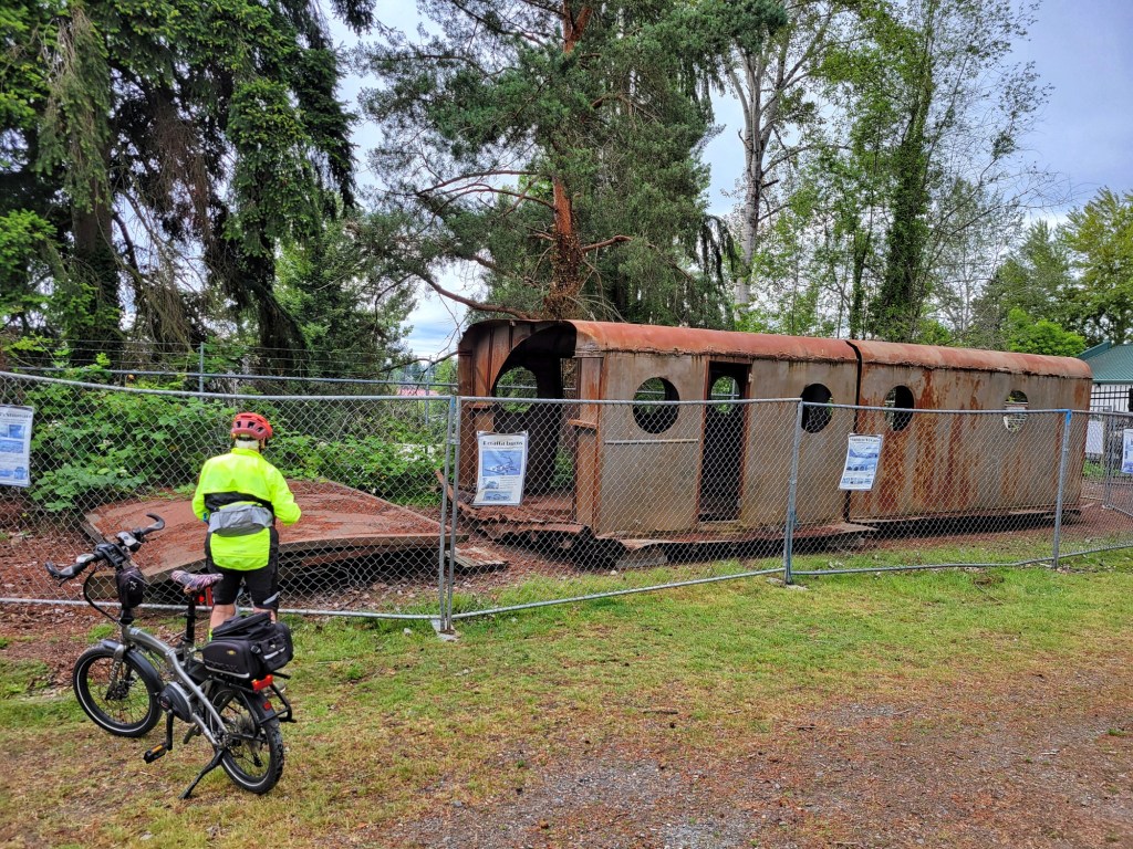 It is an unpaved trail but nicely hard packed dirt and light gravel that any bike can ride on comfortably. We made a stop to have a look at the remnants of the Kalakala ferry. Old is the operative word here — 1930s old.