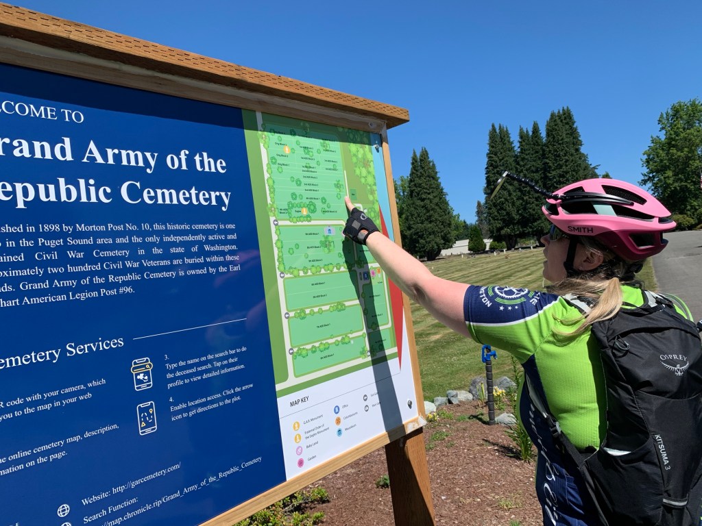 Jo joined me for one more ride as we were both free and ready for a ride in Snohomish country side with Cascade Bike club. Turned out we were the only two to join our leader, Cassie, for her ‘Cemetery and Ice Cream” ride. Weather sunny and nicely cool for our bike ride. We ventured into a little known cemetery that is tucked behind some stores in a small mall.