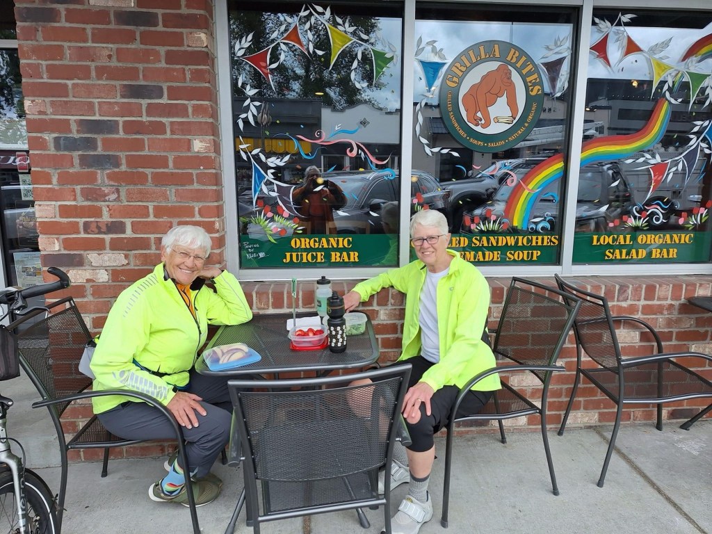 Kathy arranged what she has come to call her ‘birthday ride’ as she often does do it on her birthday. Jo joined the two of us for a ride into Snohomish for lunch on a leisurely, relatively short and beautiful country ride. I didn’t get any photos of the countryside and farm animals, but Kathy snapped a picture of me and Jo at the lunch stop.