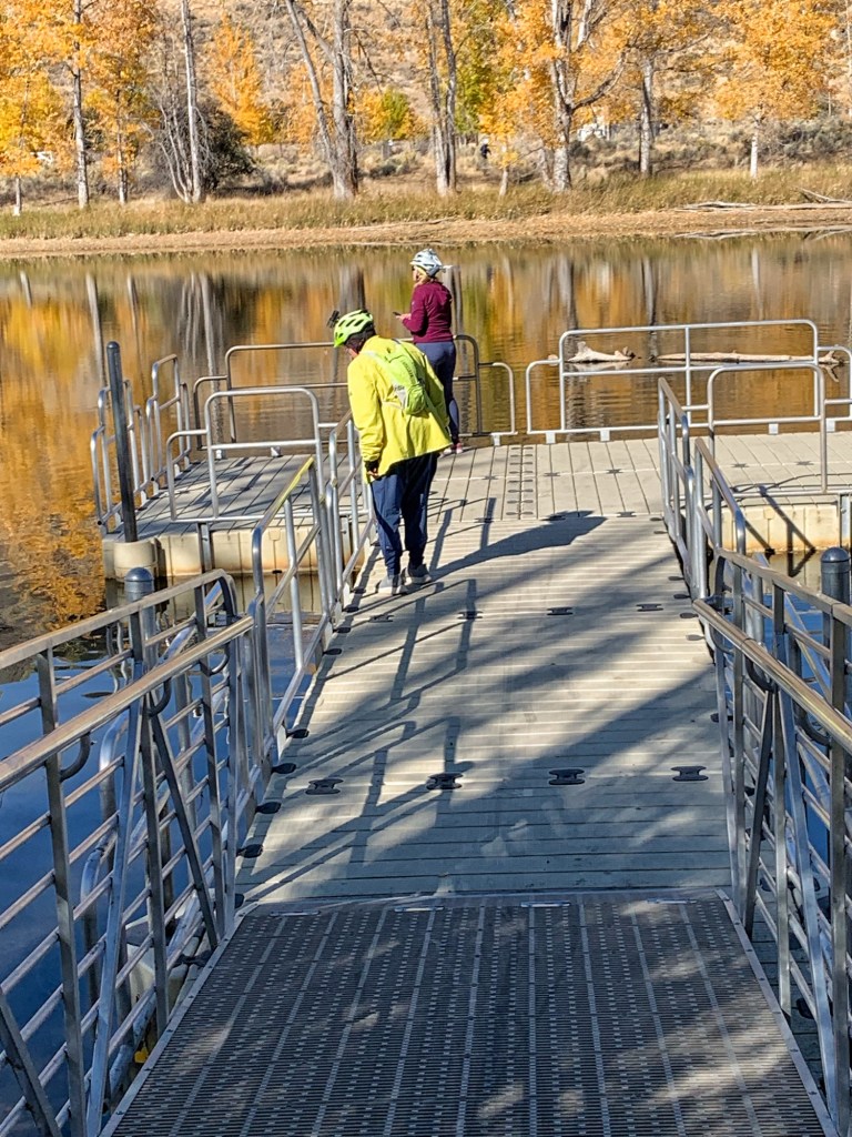 Meandering around brought us to the marina where Susan and Jen were sure to check out the floating fishing dock. Noter the fall color reflecting in the lake.