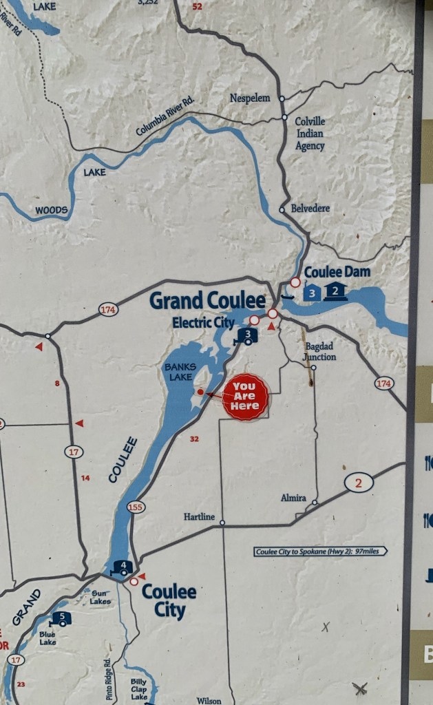 The morning had a bit more chill and the clouds had rolled in to cover much of the sky. But it all brought another great day to ride our bikes. Just not as blue as yesterday. Today’s route would take us to Electric City, just about 4 miles south of Grand Coulee.