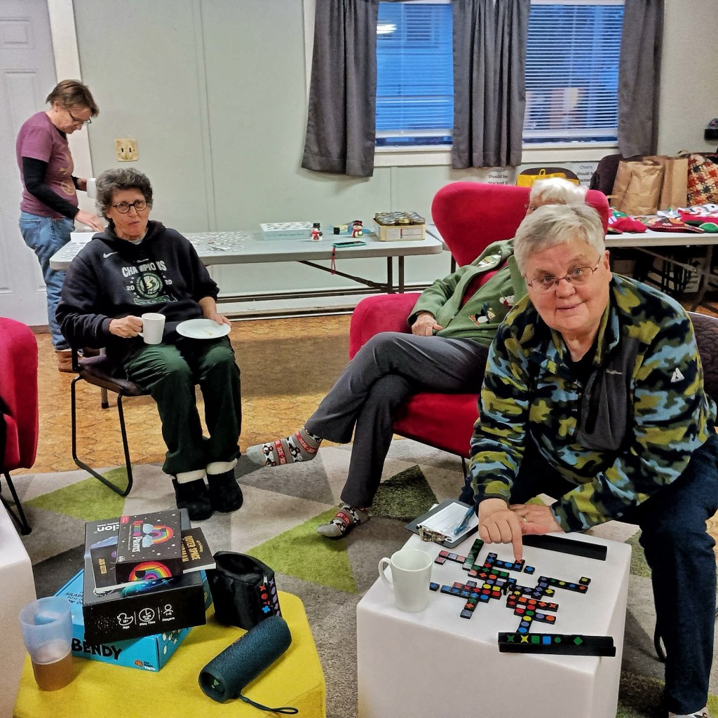 We have games and puzzles all around. Susan demonstrates the game “Quirkle”. And Kristi in the background works on a jigsaw puzzle.