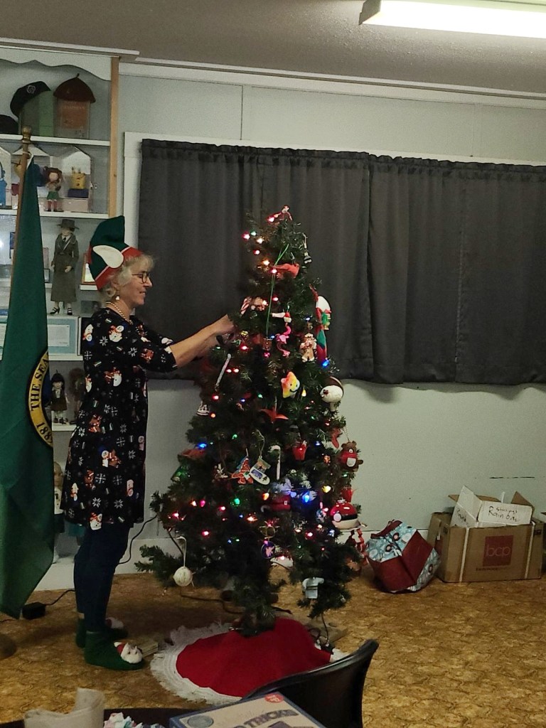 Someone brings a tree, and everyone has a hand in decorating it. Here Kristin puts some finishing touches on this years Tanenbaum.