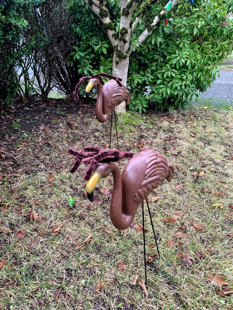 At least the start of the morning stayed fairly dry as I was experiencing only some light drizzle as I cycled along my neighborhood route. Came across Christmas Flamigoes along the way.