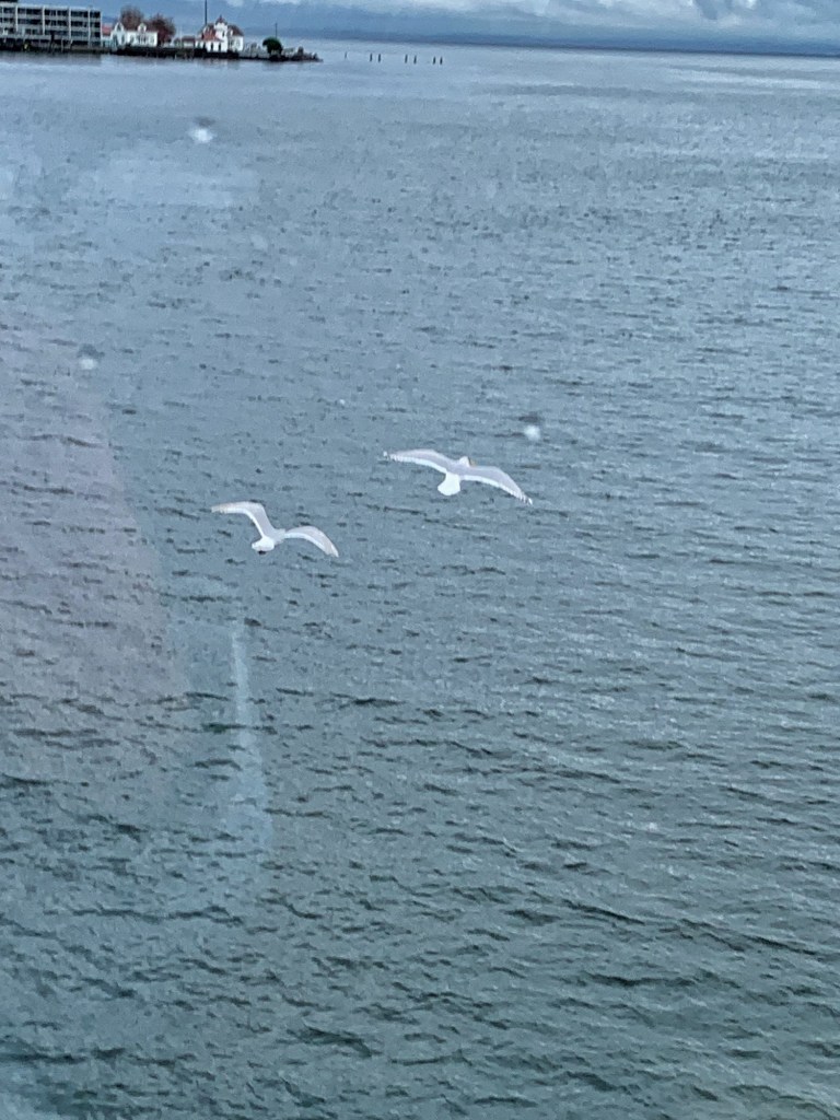 As they always do, a few gulls escorted the boat to the next stop which is about a 15 minute sail. Some raindrops on the window and a slight reflection of my jacket.