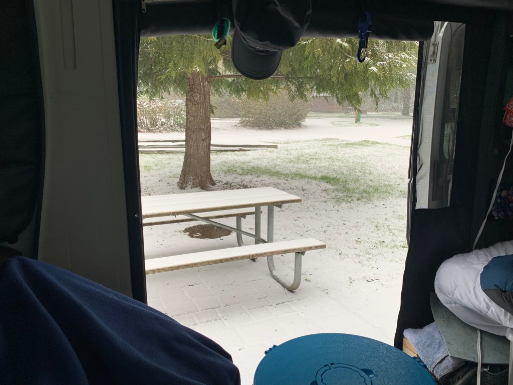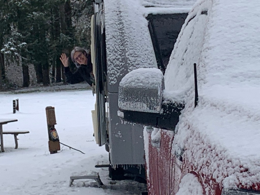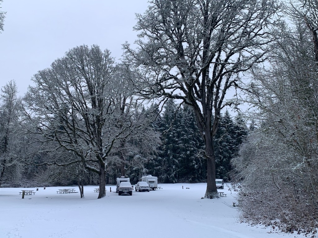 So .. we left home a day early as driving conditions were predicted to be horrendous the next day. Those predictions proved to be very true. Our 4+ hour drive down to Newberg Oregon, on Wednesday morning was smooth as silk with no weather concerns and little traffic all the way. We snuggled into our campsite and visited with the only other sister we knew was here, then called it a night.