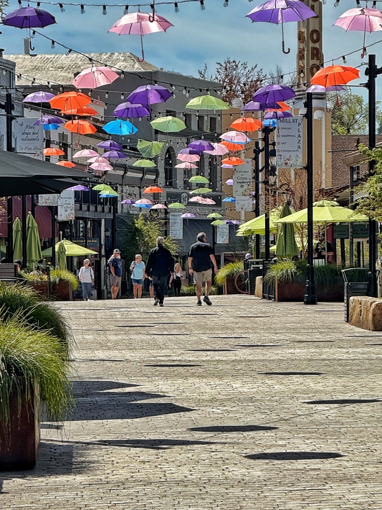 Susan joined me for our two rides. The one took us to Grass Valley with the walking/walk your bike mall and umbrellas hanging over head. Reminded me of places in Europe. We would return here for dinner, window shopping and ice cream the following night with our friends Penelope and Barb.