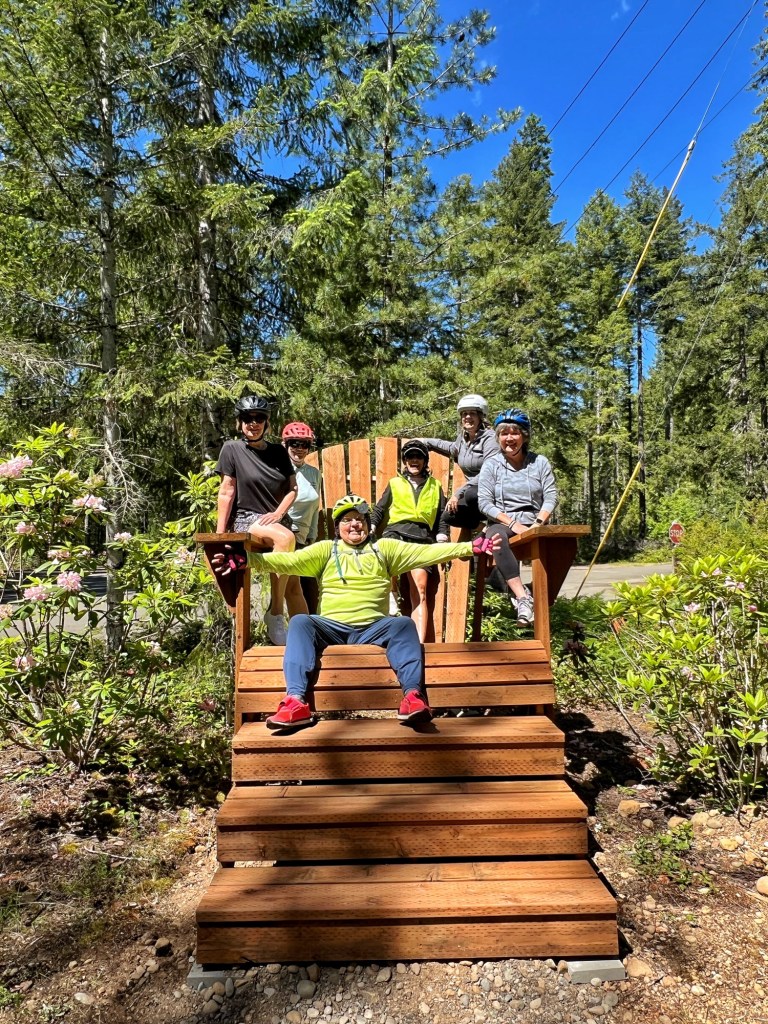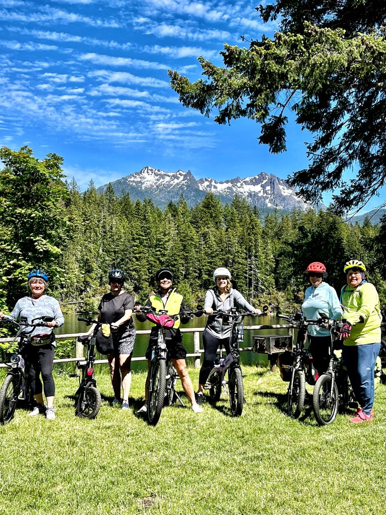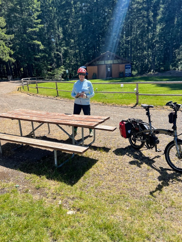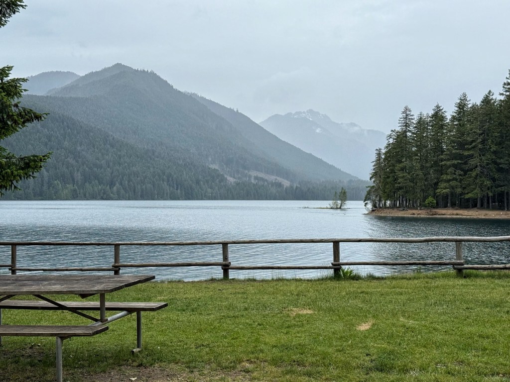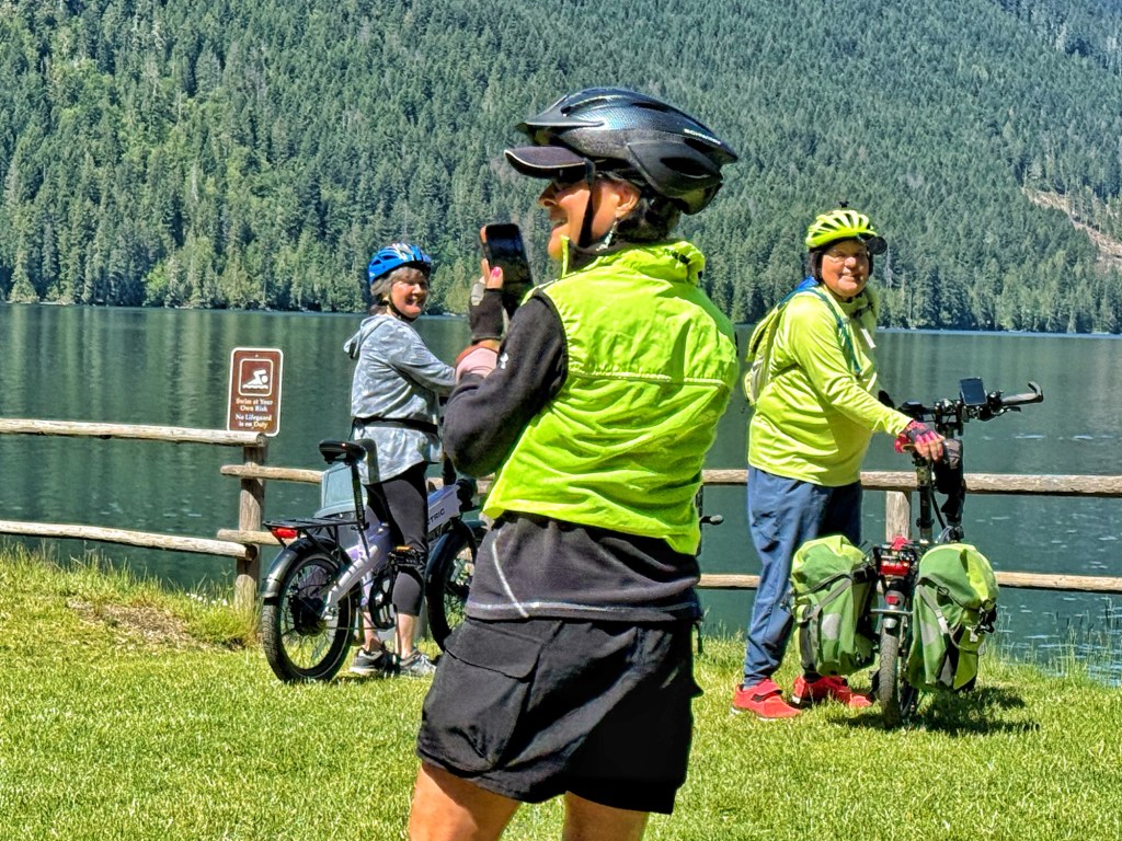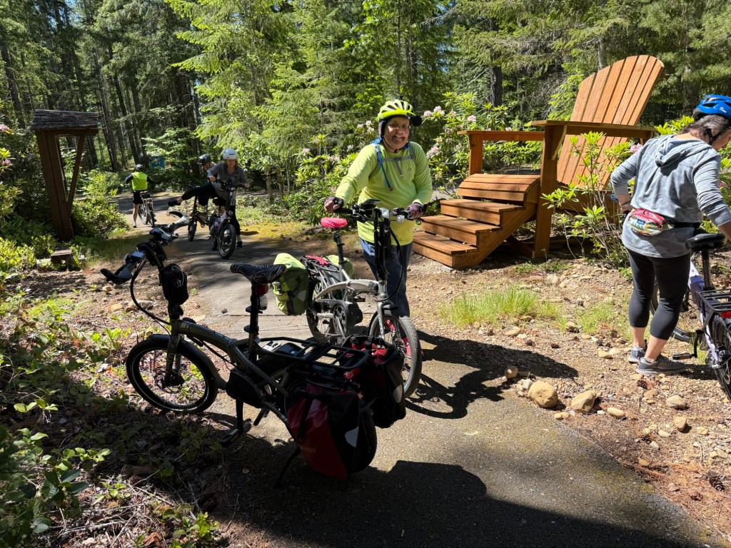 Eighty degrees and sunny for our bike ride yesterday; we awoke to heavy rain and fifty degrees this next morning. We drove from home in rain, mist and heavy fog until well out of Seattle. NOW we were on the road to our “off book” (meaning not an official) Sisters event in Hoodsport Washington. We stopped in Hoodsport for lunch/dinner before getting to our camp ground.
