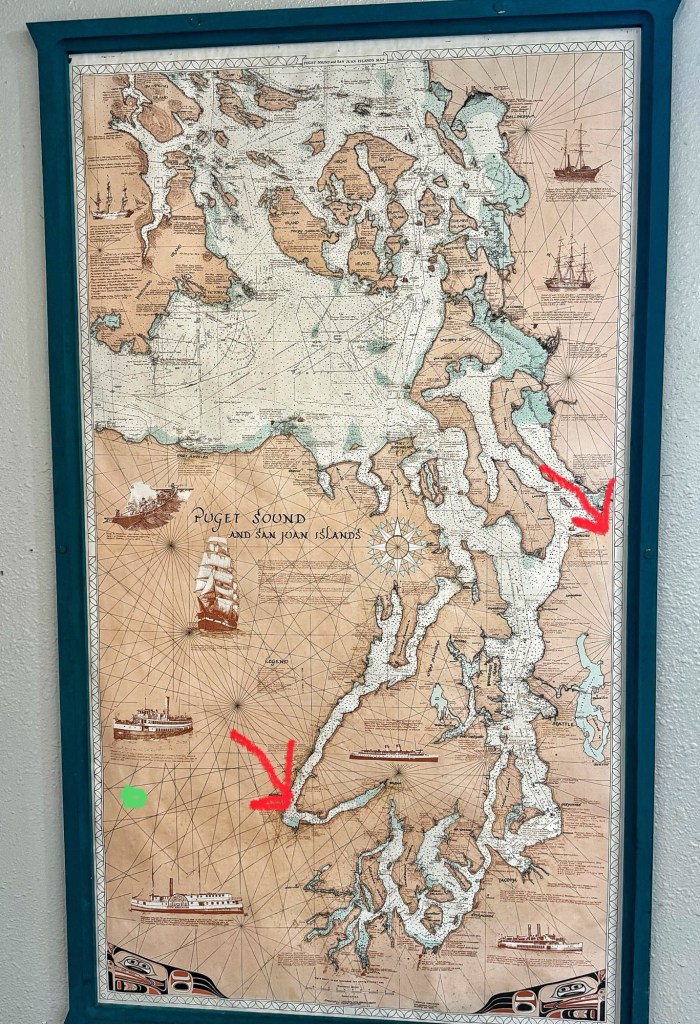 As an attempt to show where we are, I took this photo at the cafe and have marked it for a rough idea of where we are. The top red arrow is Mukilteo (where we live), the bottom arrow is Hoodsport, and the green dot is roughly where the campground is. Roughly because Lake Cushman is not shown on this map.