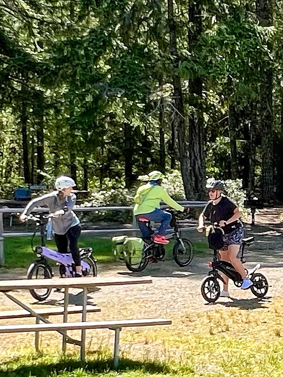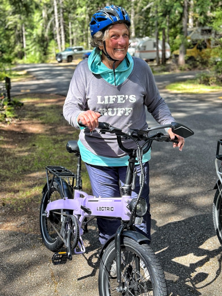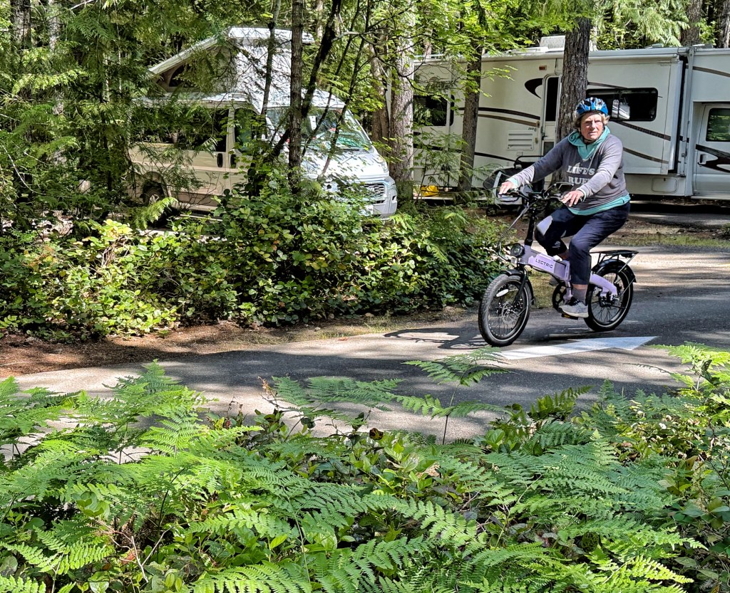 Our first full day here, Friday, was full of sun and temps in the high 60s. Several of the sisters had brought their bike and we did want to ride. The main road out of camp is not bike friendly as it has blind winding corners, no bike shoulder, and some fast traffic. Boo Hoo. So we joined up for a spin through all the loops of camp and and had a fine time for ourselves.