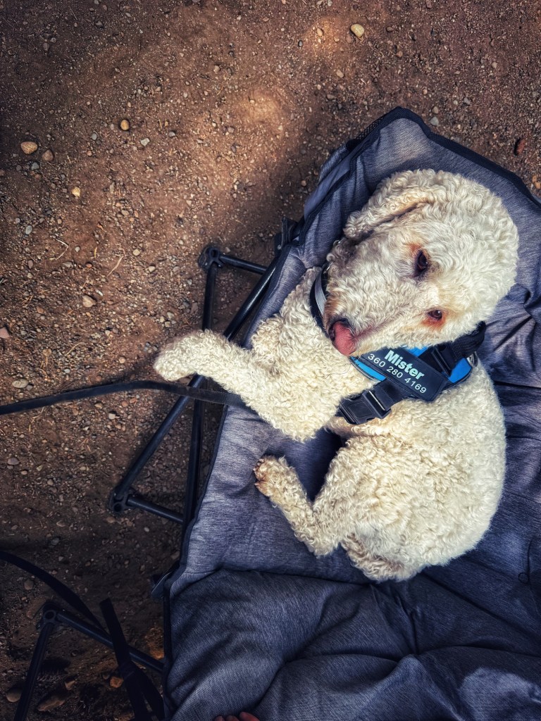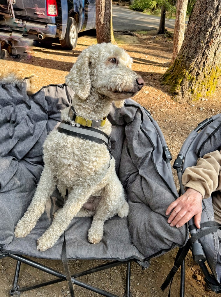 Now it is Sunday, which is the end for this outing, and we say our farewells and “see ‘round the campfire” to our friends. As the few of us linger until the last moments and sit around for chatting, “Mister” takes the star lead. He is our camp host’s (Cindy) dog who has his own (big, comfy) camp chair and is sweet and friendly as can be.