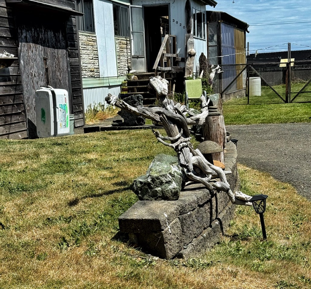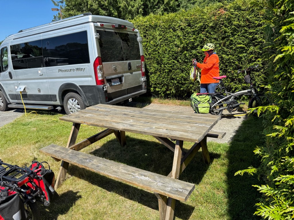 We were on the 8:30 a.m. ferry, a reason to have stayed nearby for the night, to Vancouver Island and Salmon Point Resort campground. There was more space, and less like tinned sardines here than in Voucouver, but too many RVs to have a nice plot to ourselves. The parking was helter skelter at best, and every RV is situated very close to your neighbor!