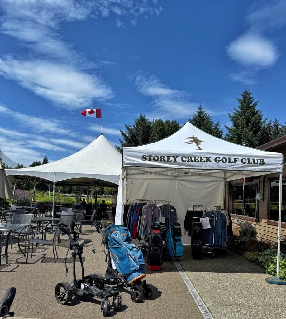 It was getting hot, I had not dressed for a bike ride that I did not think we would do, and I needed a light shirt! We pulled into the Storey Creek Golf Club and lo, there was a sale rack that had just the thing I needed.