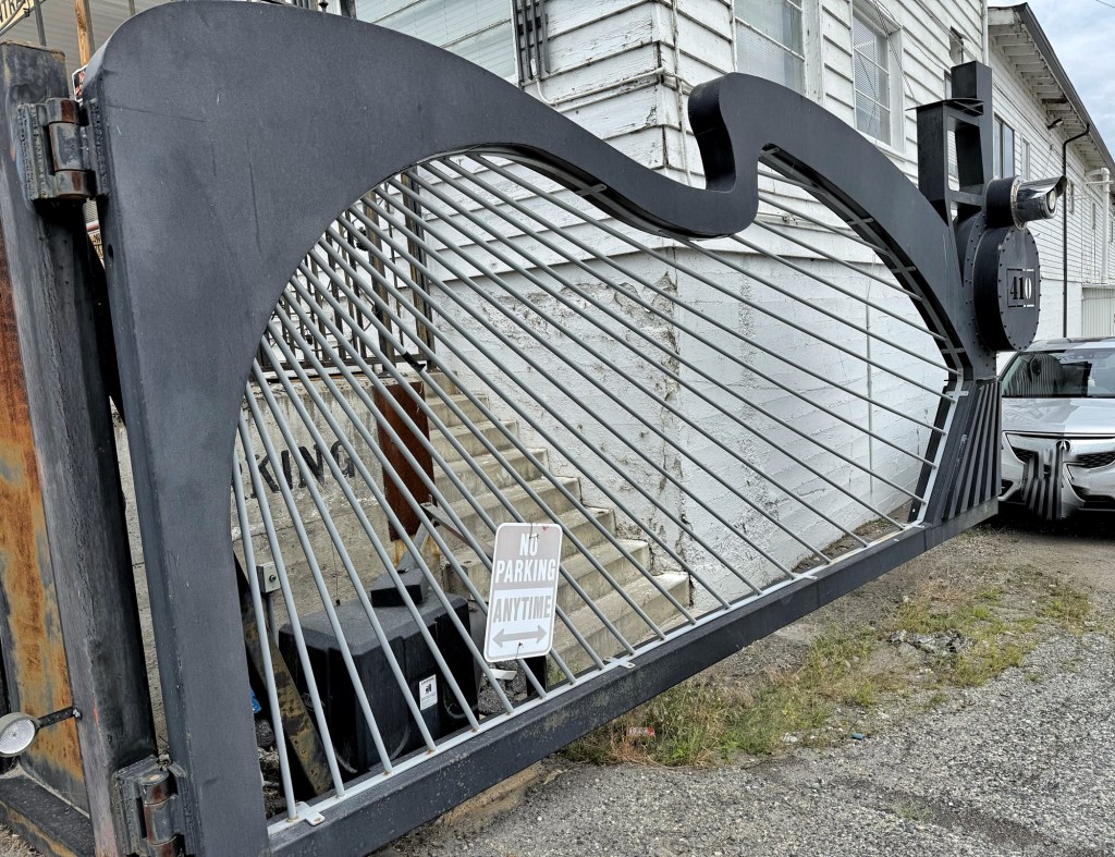 This was a relatively small gathering of sisters — 12 to start and one had to cancel. There was a craft thing, but neither Susan nor I wanted a cork trivet so we passed on that. We joined together for the first and second night’s potluck dinner, had morning coffee and treats, and loaded up two vehicles for a drive to lunch. Some did get an item or three from the thrift shop before getting to lunch. During that stop I mainly strolled around outside, and could not resist this gate that, to me, looks a bit like a harp. Anything to busy myself from shopping for thrifts.