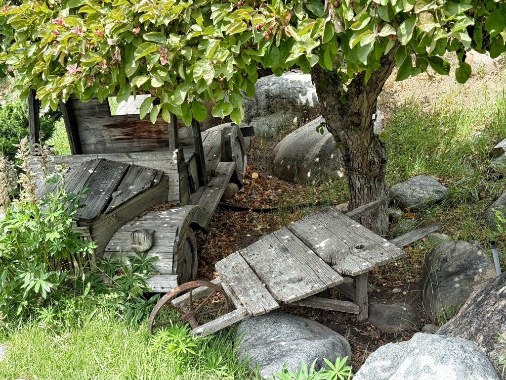 The ‘Flintstone car‘ is here, tucked under the trees.