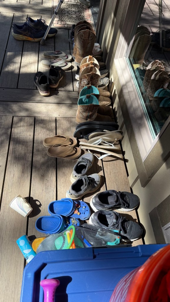 Going inside to cool down in the AC and get ready for lunch (yes, ice cream dessert first then lunch), everyone had to take off shoes for the shoeless house. Sarah of course was often seen trying to keep them all in some semblance of order.