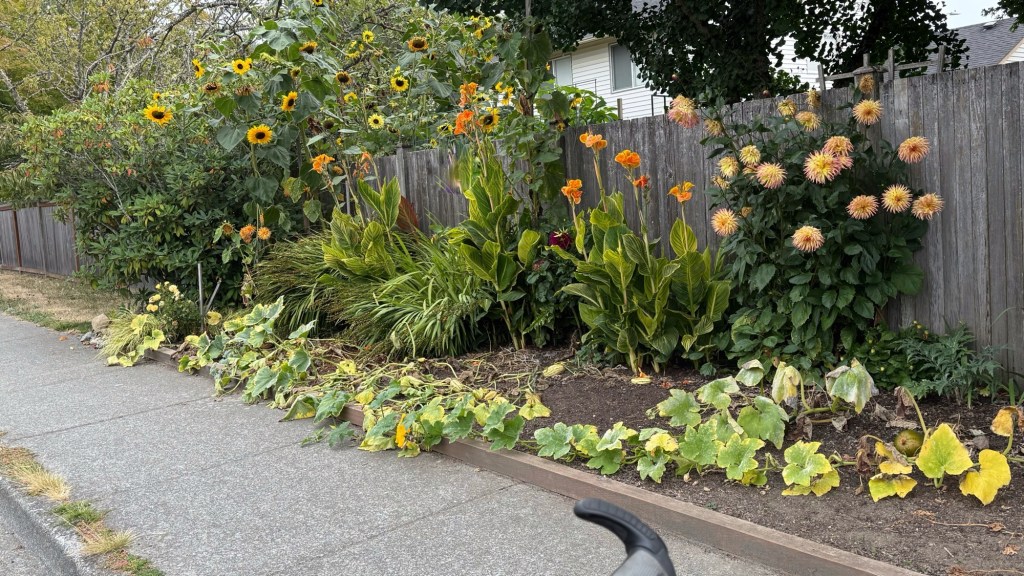 Rounding a corner I was pleased to come upon some of the fall color of this garden that is outside the fence of the gardener’s yard. I would expect it to be INside the fence but this was a surprise. Releasing my tight grip on summer is aided by the bright colors of fall.