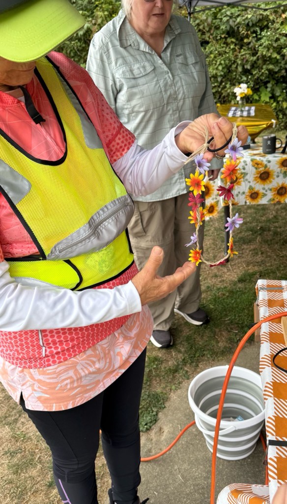 Time to get bikes and gear ready, but first a few had time to make their flower headbands.