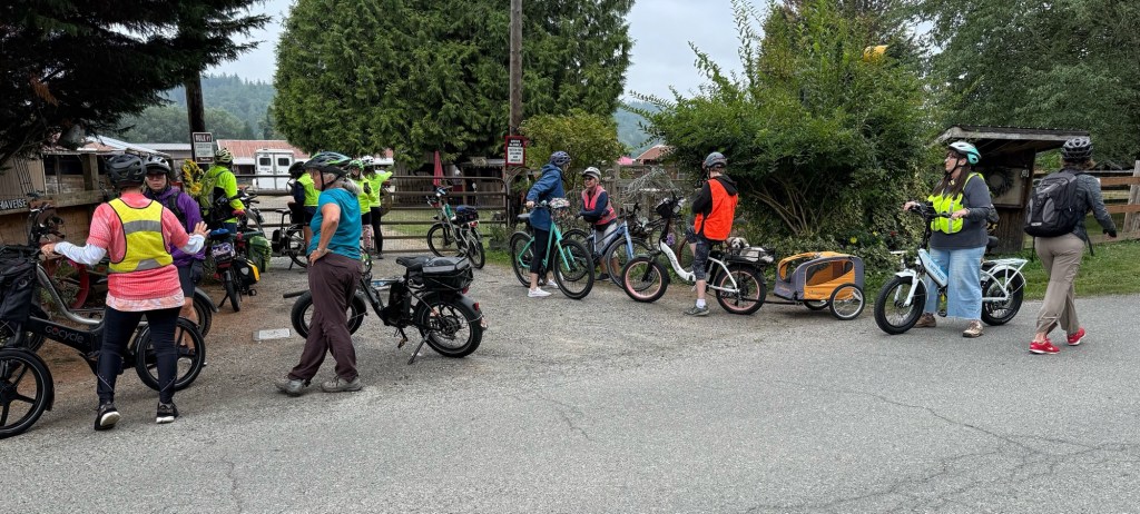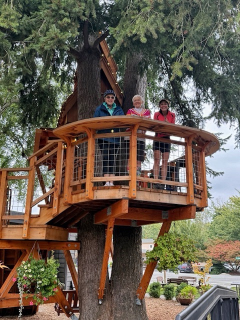 Eventually we did continue our ride to the Aroma cafe for lunch and/or coffee/tea. We filled two picnic tables but I didn’t get one photo of us there. The only photo is the one of three of us (Denise, me and Nese) in the tree house.