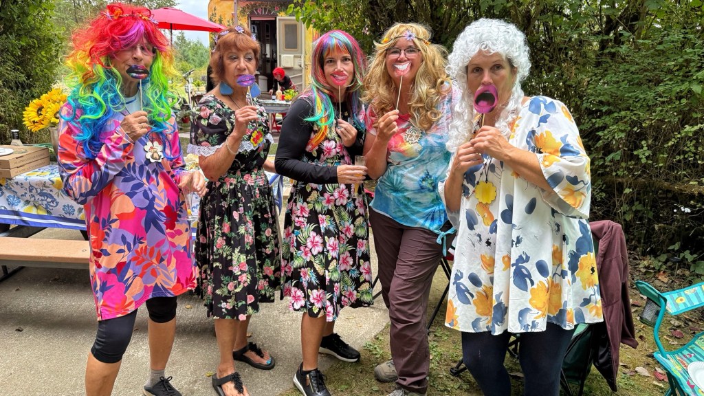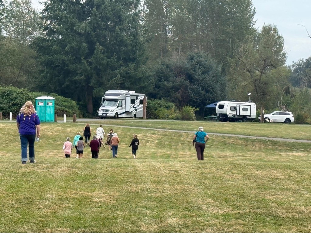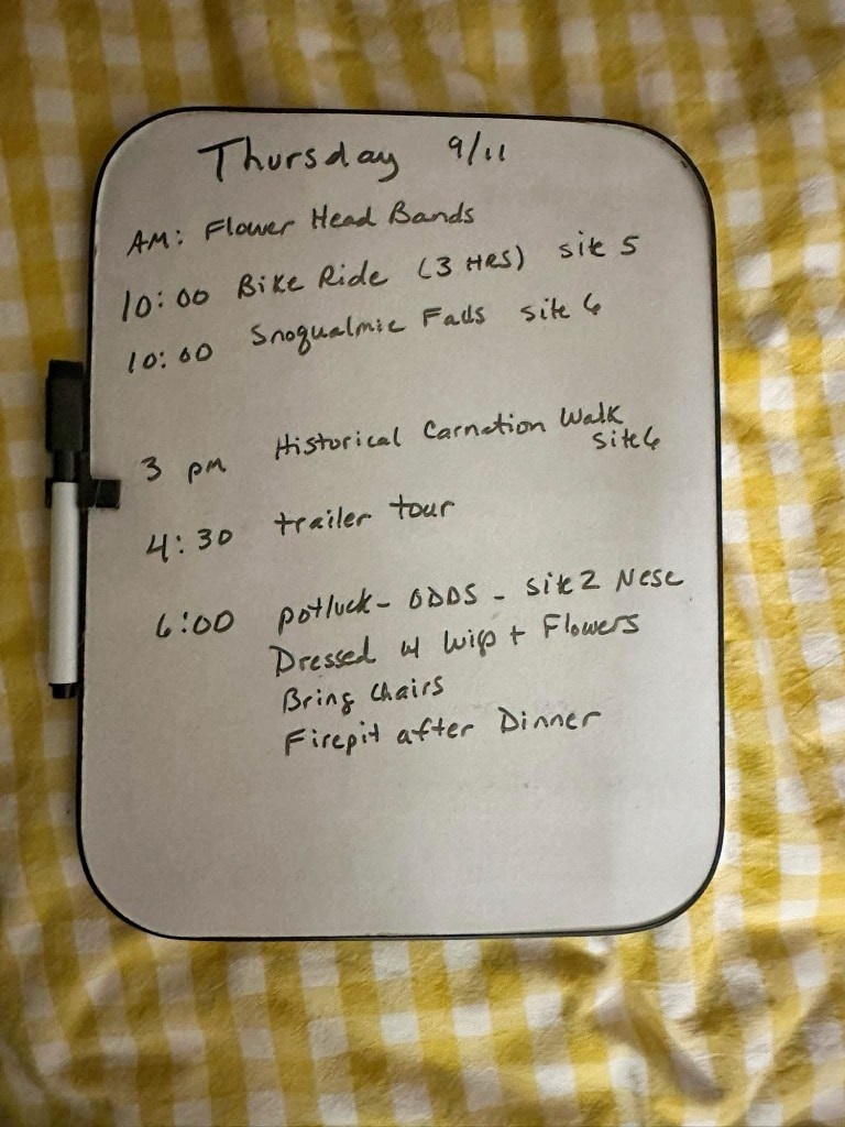 Off we went for the hour drive to Carnation for our Flower Fun Camping outing. We arrived with plenty of time to set up camp before joining the first event —- potluck appetizers enough to be dinner, and our fireside chat, meeting and introductions. Our hostess, Lisa, gave us the rundown of activities available over the next 3+ days.