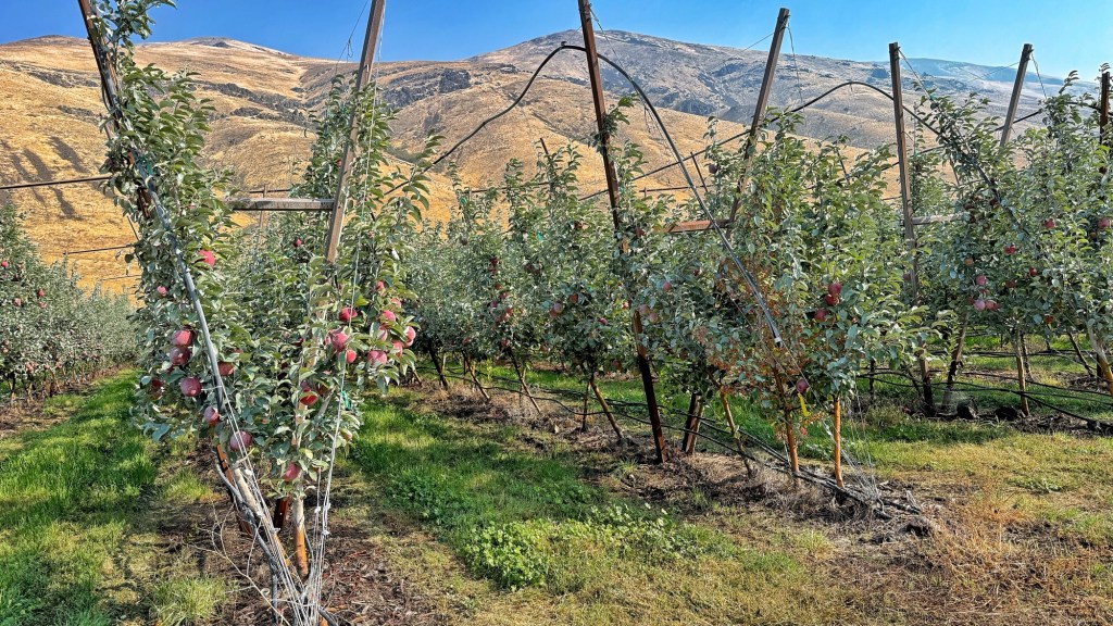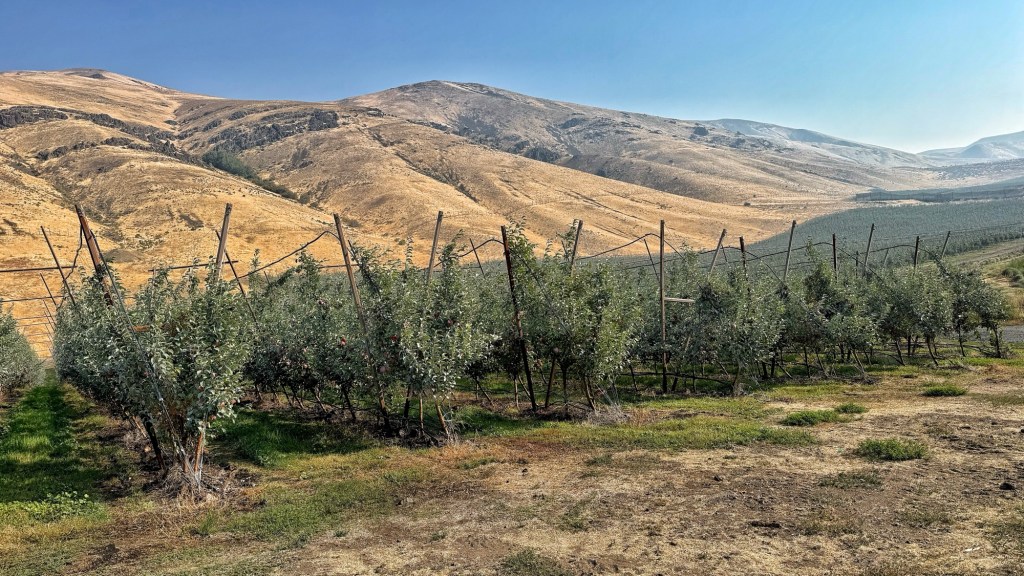 The green strip in the middle shows plenty of orchards at these rolling foothills.