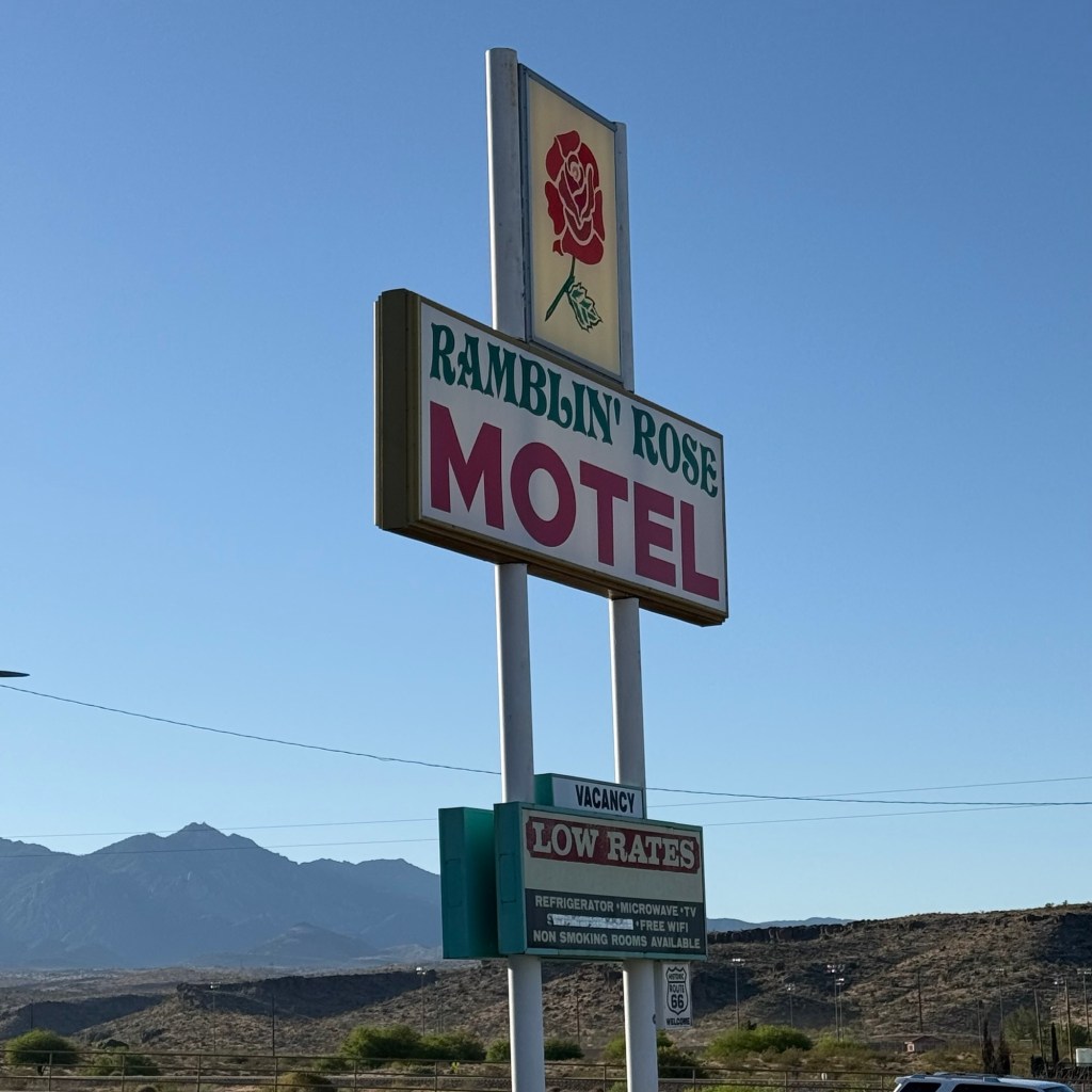 Departing our abode du nuit in Kingman, AZ —- Ramblin’ Rose is several steps up from Super 8, but just.