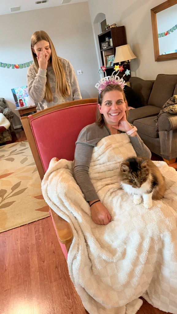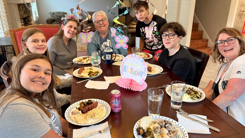 There would be birthday dinner prepared by Angie, Jeremy’s mom. Lucy set up her mom on a throne with a crown. Tierra anyway.