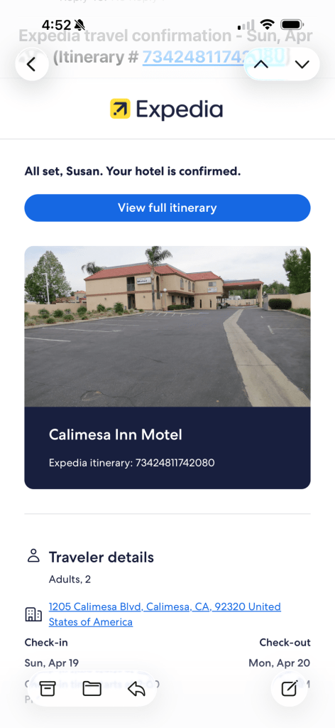 A phone conversation with Sarah brought us information that the next day it would be raining a lot in and on the way to Elk Grove. We decided to drive from Calimesa directly to Sarah’s.
