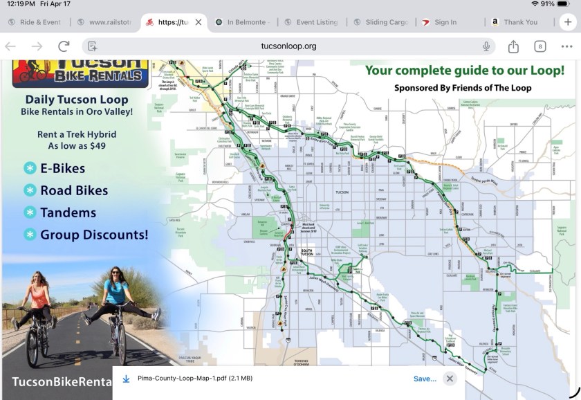 “The Loop” is 137 mile trail network that surrounds the city of Tucson. There are many trailheads where one can join parts of the trail. The ‘network’ can be tricky to follow, so to ride the entire trail takes deep research, or a local resident to find their way.