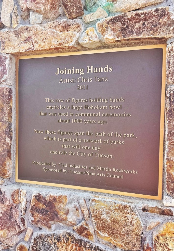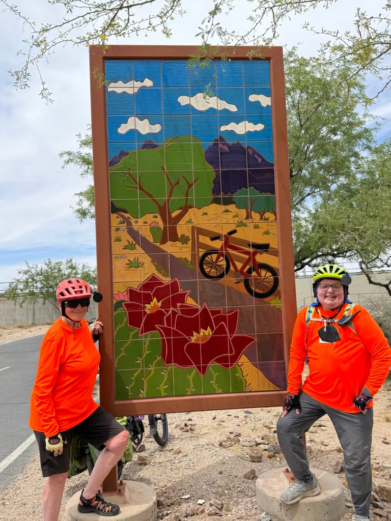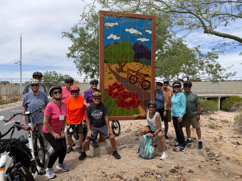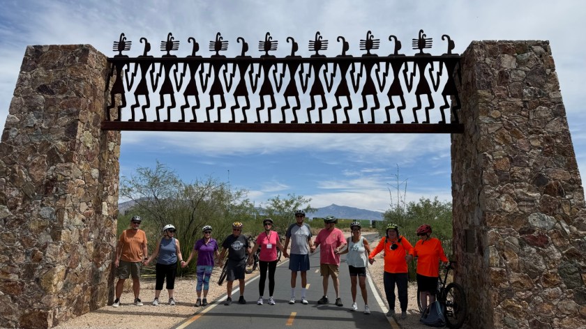 There of our riders opted to shorten their ride so we now had ten of us. The goal was to get to the Joining Hands Arch as our turn around point. The information sign was placed in 2011, the trail now does (intermittently) encircle the town of Tucson.
