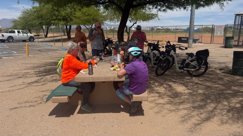 Returning to camp, we stopped at a park along the trail to have our lunch. We had each brought our subs that were left after dinner last night. We thought they were even better today. Bike riding will do that for you.