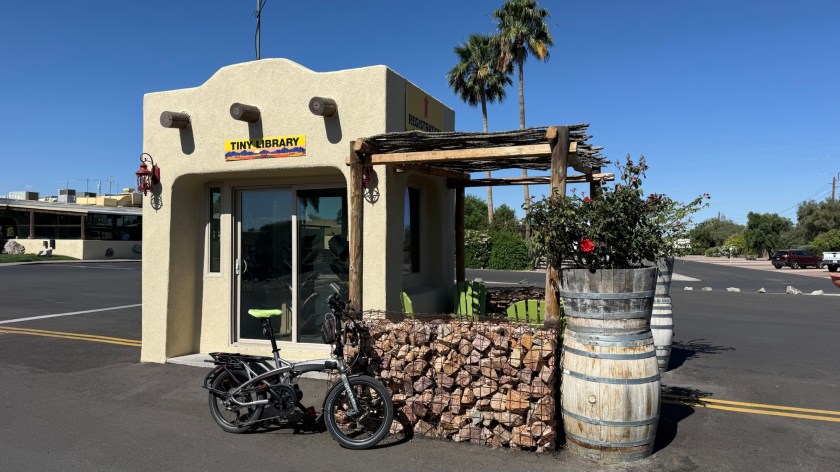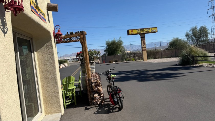 Susan and I had signed up with the coordinator of this Pleasure Way Rally to lead a bike ride on one of the days. Never having ridden any part of the loop before, we were not sure if driving to a trailhead from camp might be necessary. On our stay in town the day before going on to Patagonia Lake, we stopped here at the KOA and Susan spoke with the manager who has a daughter familiar with the trail. She gave us directions to get onto the trail right from camp. YAY!!