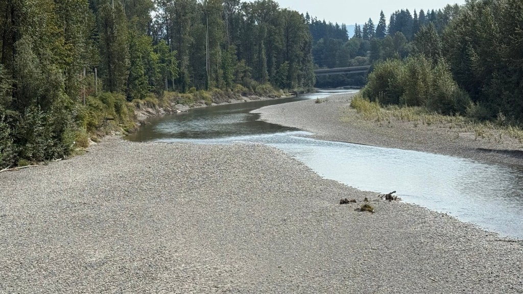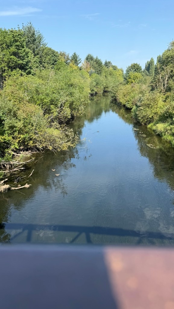 Another bridge, another river. The Stillaguamish is a bit dry at this time. We often see fishers and sun bathers and waders here, but not this time.