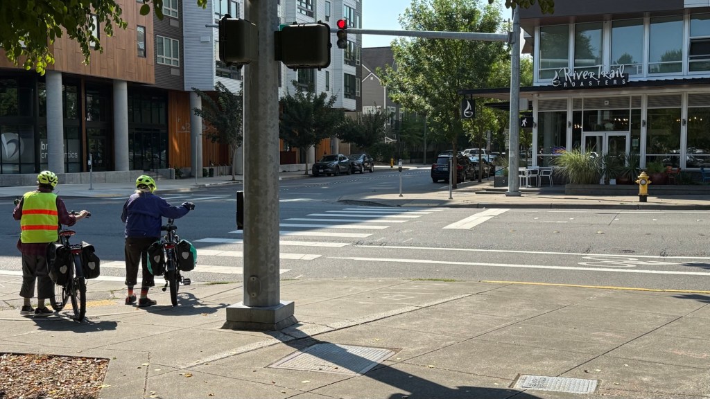 On the other side we continued on a connector trail to the Riverside Roasters and our stop for tea/coffee/treat/lunch. Roasters is across the street.